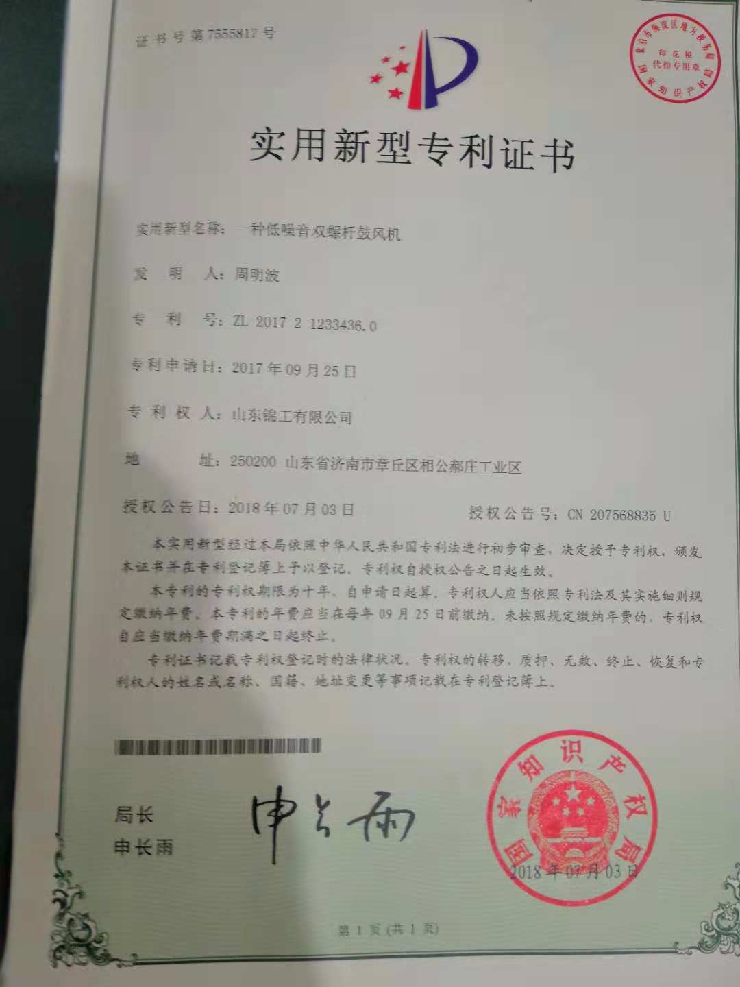 錦工風機再獲多項羅茨風機專利及軟著