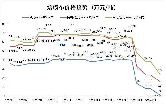 自5月18日起,熔噴布市場出現了深度的兩極分化。一邊是符合出口口罩要求的熔噴布極度缺乏,市場上基本看不到,導致80%的口罩廠停工;一邊是所謂的“95+”布價格崩盤,從月初的70W一噸狂跌到20W以下仍無人問津。