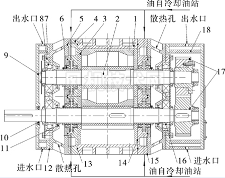 1. 機殼 ; 2. 轉子部; 3. 側板; 4. 隔板; 5. 墻板; 6. 機械密封部; 7. 軸承; 8. 軸承座; 9. 副油箱; 10. 骨架油封; 11. 骨架油封; 12. 油箱密封墊; 13.O 形圈; 14. 側板密封墊; 15. 墻板密封墊; 16. 軸承; 17 . 齒輪部 ; 18. 齒輪箱 .